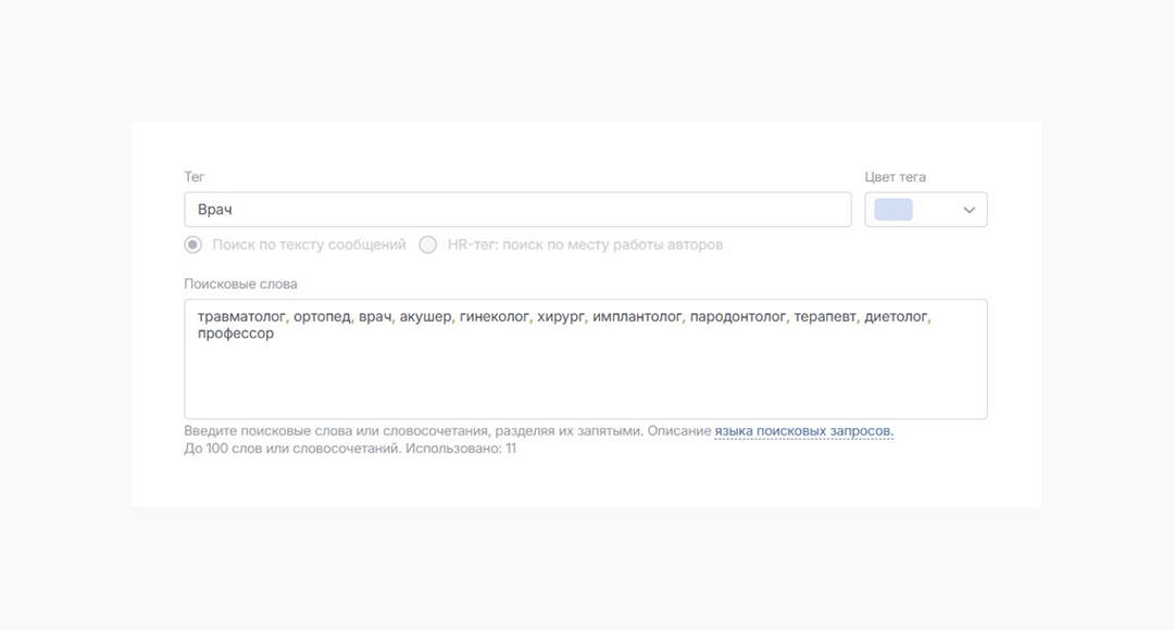 Изначально система автотегов была основана на предположениях о главных темах отзывов, касающихся клиник. Одним из примеров является создание автотега "Врач", объединяющий сообщения, содержащие ключевые слова, относящиеся к медицинским специалистам. Это позволило определить процент таких отзывов в общей массе и провести их подробный анализ.