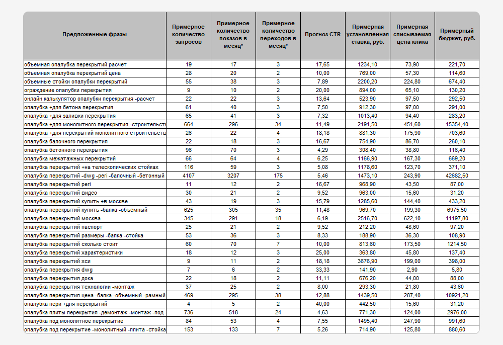 Далее собрали ключевые запросы и на их основе составили предварительный прогноз по бюджету и цене клика в разрезе фраз.
